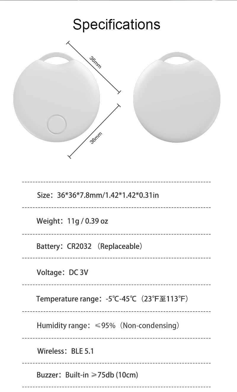 • أبل تجد بلدي متوافق :يتوافق هذا iTag الذكي تمامًا مع تطبيق Apple fالعثور على موقعي ، وهو تطبيق تتبع مواقع شائع ، مما يضمن التكامل السلس وتحسين الأداء الوظيفي.